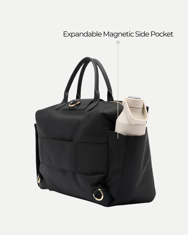 Five versatile carry options let you wear Milana your way: over the shoulder, crossbody, in hand, as a backpack, or clipped neatly onto your pram. Take it travelling with the new addition of a luggage sleeve, and exterior side pockets featuring an expandable magnetic closure, allowing you to easily fit drink bottles when needed.